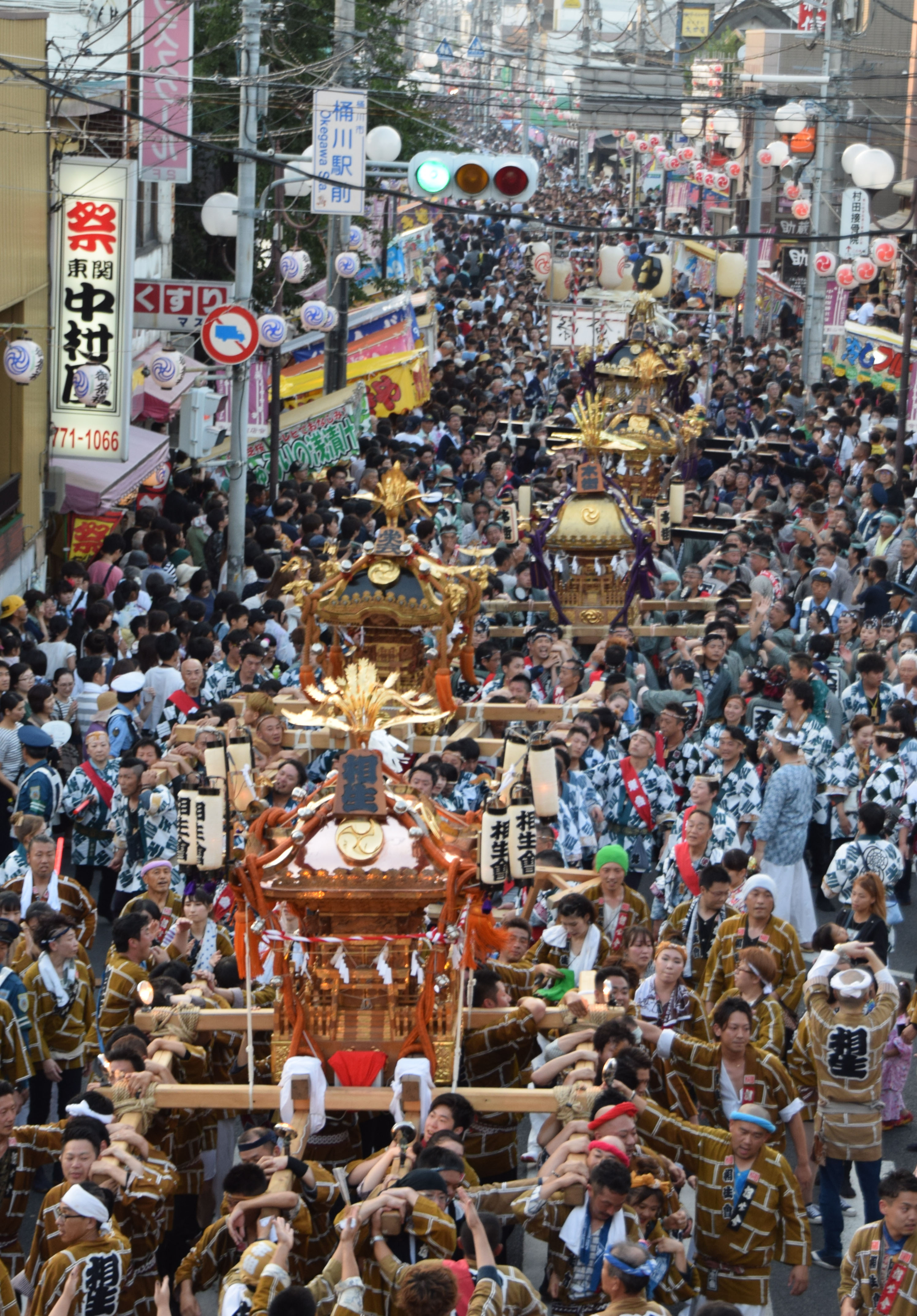 15日は、子供神輿連合渡御を皮切りに、各町会五基の神輿が一列になって中山道を進む「連合渡御」
